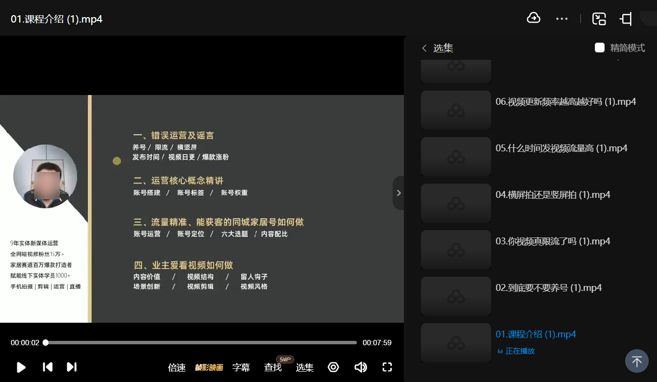课程介绍: 专为装修建材行业从业者设计,针对运营误区、账号搭建、内容选题、运营逻辑和投流获客等核心环节进行系统教学。课程包含27节视频课,从基础认知到实战技巧,涵盖账号定位、标签打造、权重提升、黄金选题、视频结构、拍摄剪辑等内容。