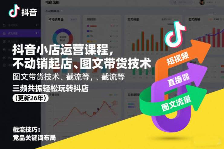 抖音小店运营课程,不动销起店、图文带货技术、截流等,三频共振轻松玩转抖店(更新26年)