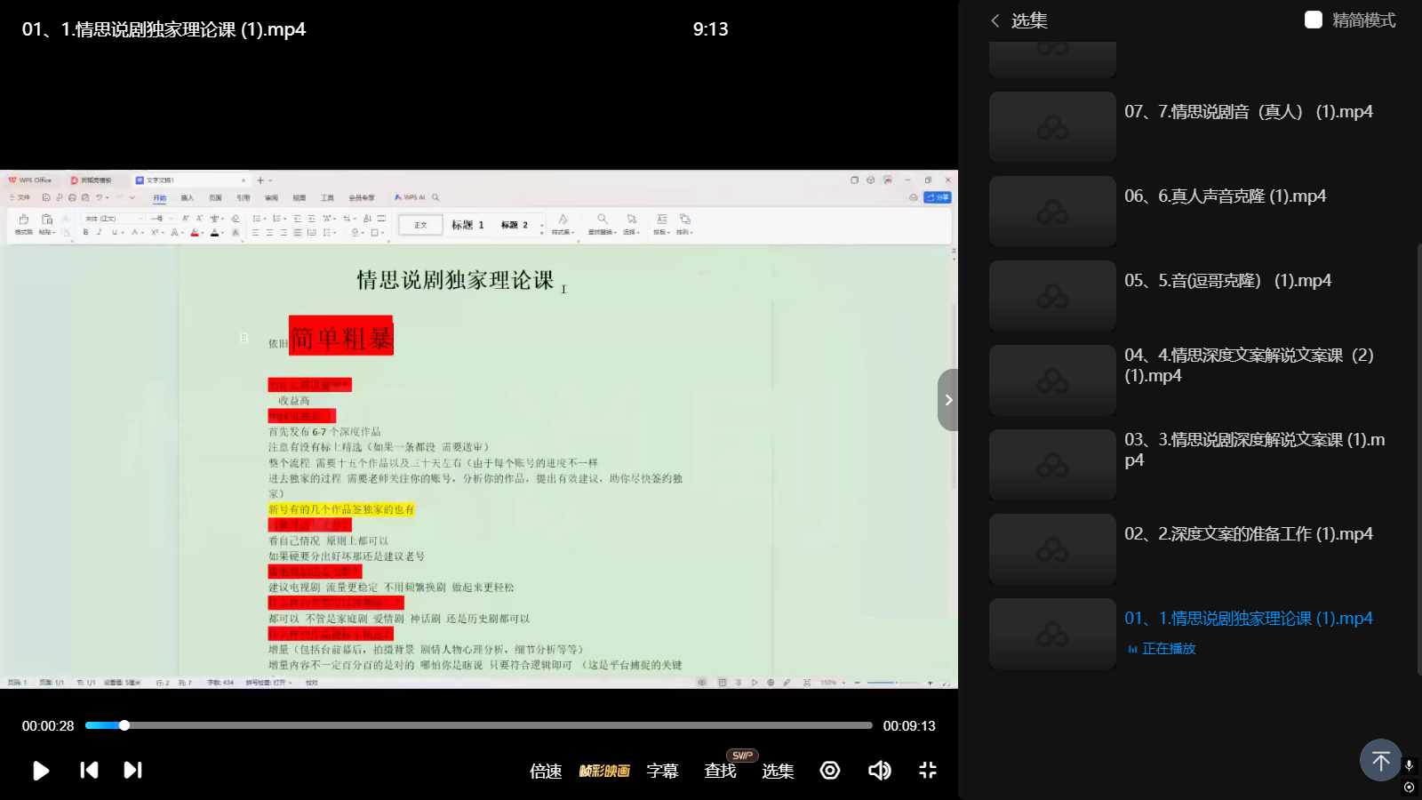课程内容: 01、1.独家理论课(1).mp4 02、2.深度文案的准备工作(1).mp4 03、3.深度解说文案课(1).mp4 04、4.深度文案解说文案课(2)(1).mp4 05、5.音(逗哥克隆)(1).mp4 06、6.真人声音克隆(1).mp4 07、7.音(真人)(1).mp4 08、8.AU插件安装(1).mp4 09、9.AU插件设置(1).mp4 10、10.独家剪辑课(上)(1).mp4 11、11.剧独家剪辑课(下)(1).mp4 影视解说赛道流量稳定、受众广泛,是普通人入局短视频变现的优质选择!这款千万粉博主亲授的独家课程,帮你跳过新手期的摸索阶段,直接掌握爆款创作和盈利秘籍,轻松玩转影视解说赛道,实现流量与收益双丰收!