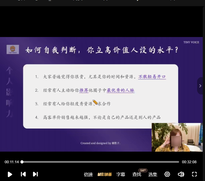 课程目录: ├──相关资料 | ├──01、个人影响力_EP1_自我营销.pdf.pdf 14.42M | ├──02、个人影响力_EP2_朋友圈.pdf.pdf 16.62M | ├──03、个人影响力_EP3_小红书.pdf.pdf 15.64M | ├──04、个人影响力_EP4_公域获客.pdf.pdf 17.08M | ├──05、个人影响力_EP5_私域IP.pdf.pdf 13.96M | ├──06、个人影响力_EP6_高价值人设.pdf.pdf 14.71M | ├──08、LIVE02个人影响力_小红书起号.pdf.pdf 14.86M | ├──09、个人影响力_EP7_知识付费.pdf.pdf 16.06M | ├──10、个人影响力_EP8_产品宣发与定价.pdf.pdf 12.42M | ├──11、LIVE03个人影响力_定位.pdf.pdf 21.92M | ├──12、LIVE04个人影响力_矩阵.pdf.pdf 17.81M | ├──13、个人影响力_EP9_IP团队.pdf.pdf 12.53M | ├──14、个人影响力_EP10_老板自我管理.pdf.pdf 11.29M | ├──15、LIVE05_胜子答疑专场.pdf.pdf 8.68M | ├──16、个人影响力_EP11_IP焦虑.pdf.pdf 11.65M | ├──17、个人影响力_EP12_持续输出方法论.pdf.pdf 10.21M | ├──18、个人影响力_EP13_个人光环.pdf.pdf 17.62M | ├──19、个人影响力_EP14_分阶段打造.pdf.pdf 10.46M | ├──20、LIVE06个人影响力_趋势.pdf.pdf 12.09M | ├──21、LIVE07个人影响力_公转私.pdf.pdf 23.69M | ├──22、个人影响力_EP15_操盘手.pdf.pdf 12.24M | ├──23、个人影响力_EP16_财务思维.pdf.pdf 13.55M | ├──24、LIVE08个人影响力_终场答疑.pdf.pdf 8.98M | └──25、个人影响力_EP19和20.pdf.pdf 20.82M ├──01、【销售自己】EP1_如何在不同场合-讲好你的个人故事?.mp4 553.61M ├──02、【销售自己】EP2_朋友圈是社交杠杆-朋友圈审美力与商业力.mp4 736.64M ├──03、【流量力】EP3_小红书的财富密码和矩阵打法.mp4 642.27M ├──04、【流量力】EP4_公域全平台获客-短视频-直播仍是王道.mp4 608.68M ├──05、【转化力】EP5_私域IP是长期商业价值的根据地.mp4 669.69M ├──06、【转化力】EP6_高客单价-需要高价值人设.mp4 786.96M ├──07、【产品力】EP7_知识IP的产品体系如何搭建?.mp4 697.14M ├──08、【产品力】EP8_引流款与利润款-如何做产品定位-定价?.mp4 675.22M ├──09、【团队搭建】EP9_如何从0到1搭建10人IP团队?.mp4 684.62M ├──10、【团队搭建】EP10_既是老师又是IP-如何平衡好双重身份.mp4 546.45M ├──11、【IP情绪管理】《IP情绪管理篇》EP11EP12.mp4 127.05M ├──12、【光环溢价】《光环溢价篇》EP13EP14.mp4 145.14M ├──13、【品牌货币化】个人影响力打造-《品牌货币化》EP1920.mp4 146.65M ├──14、【直播场01-08】《从教培行业到个人IP的完美转型》by胜子.mp4 207.45M ├──15、【直播场01-08】《小红书从0到1起号的技术、心态与思维》by胜子团队.mp4 177.56M ├──16、【直播场01-08】《什么是好的人设、标签、定位》by胜子.mp4 190.45M ├──17、【直播场01-08】《小红书矩阵150w粉丝的操盘细节》by胜子团队.mp4 128.15M ├──18、【直播场01-08】胜子答疑专场.mp4 590.25M ├──19、【直播场01-08】《立足2024年-未来3年的个人IP怎么做》by胜子.mp4 168.57M ├──20、【直播场01-08】《公转私的具体手法》by胜子团队.mp4 299.75M └──21、【直播场01-08】回答社群优质问题课程串讲by胜子.mp4 141.31M
