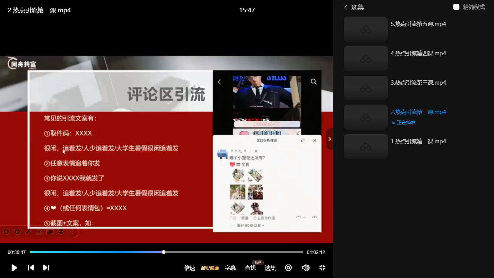 课程内容: 1.热点引流第一课.mp4 2.热点引流第二课,mp4 3.热点引流第三课,mp4 4.热点引流第四课.mp4 5.热点引流第五课,mp4