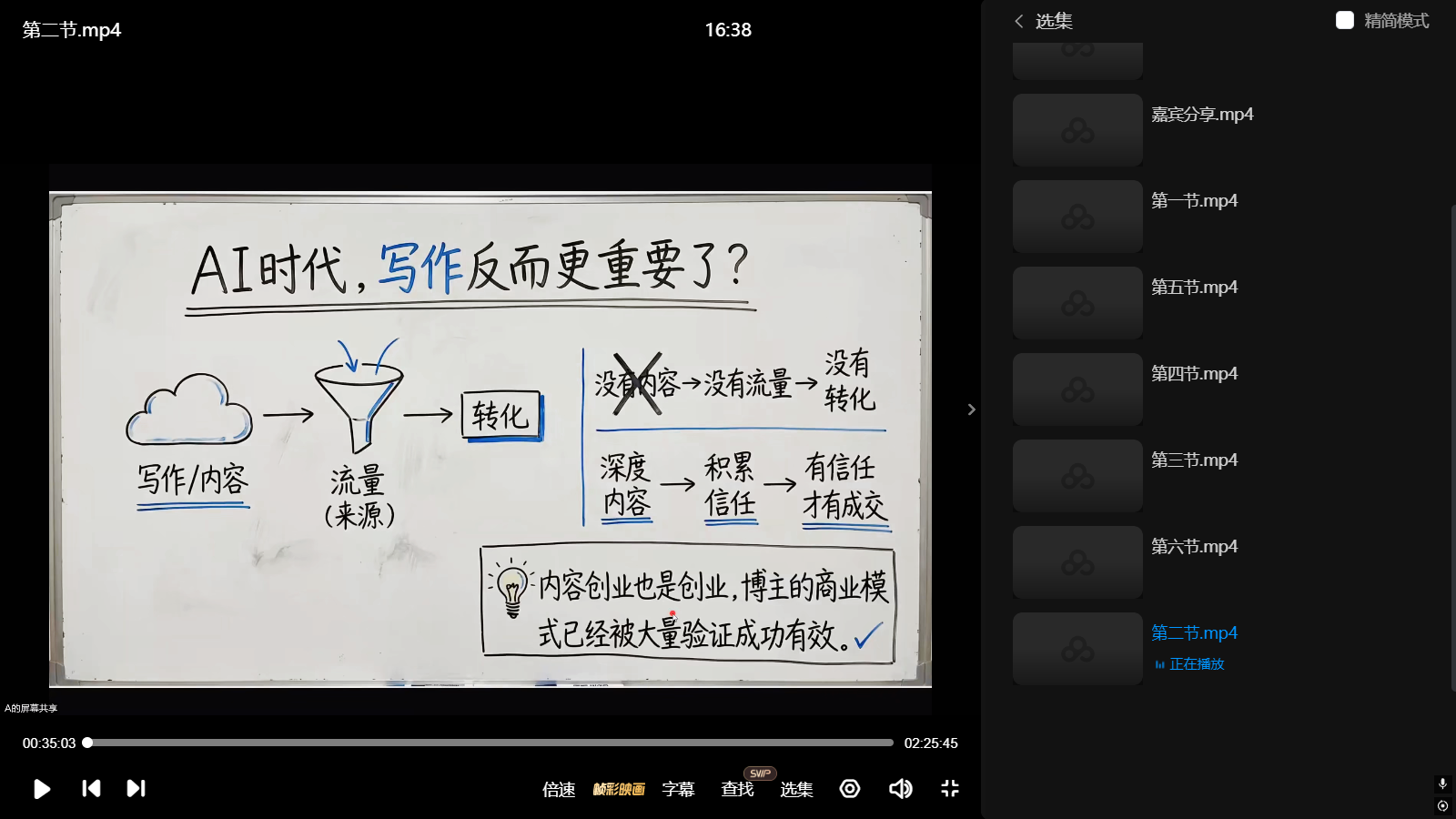 课程内容: 课堂资料 开营仪式.mp4 第一节.mp4 第二节.mp4 第三节.mp4 第四节.mp4 第五节.mp4 第六节.mp4 嘉宾分享.mp4 嘉宾分享2.mp4 虚拟产品月入5W文学分享.mp4